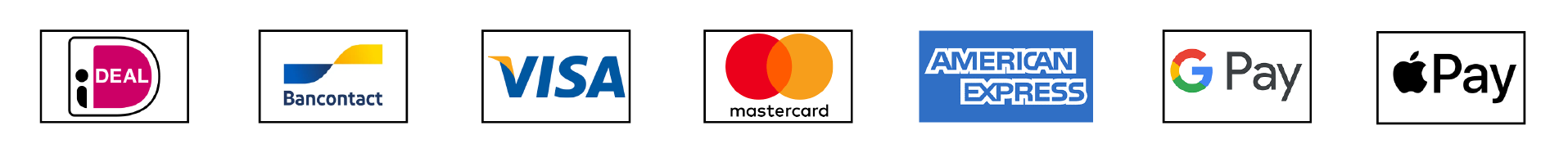 Amex, Maestro, Visa, MasterCard, Apple Pay, Google Pay und PayPal.